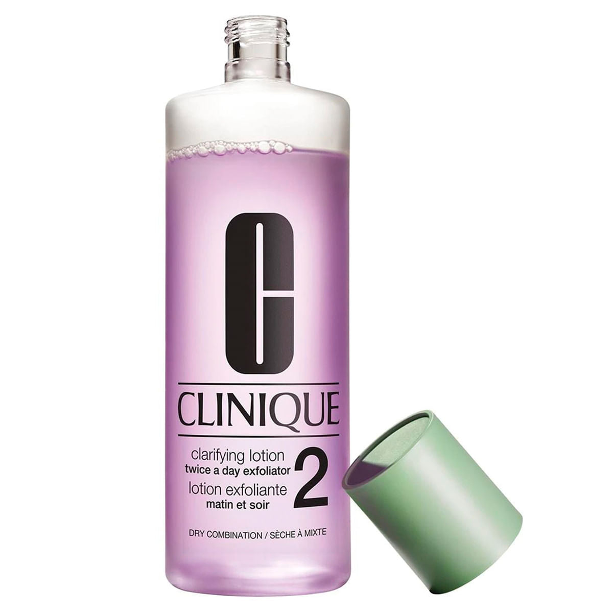 Clinique's Clarifying Lotion 2, specially formulated for combination and dry skin, gently exfoliates the skin, removing impurities and dead cells.