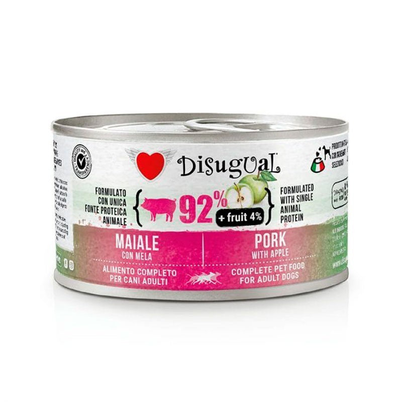 Disugual Fruit Pork with Apple is a high-quality wet food for adult dogs that combines the delicious taste of pork (92%) with the nutritional value of apple (4%).