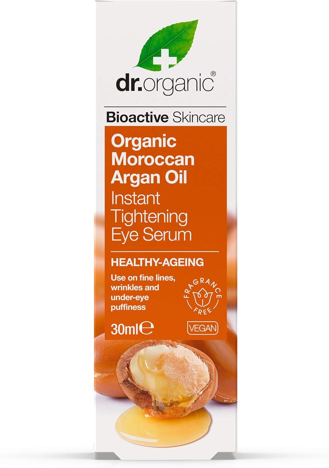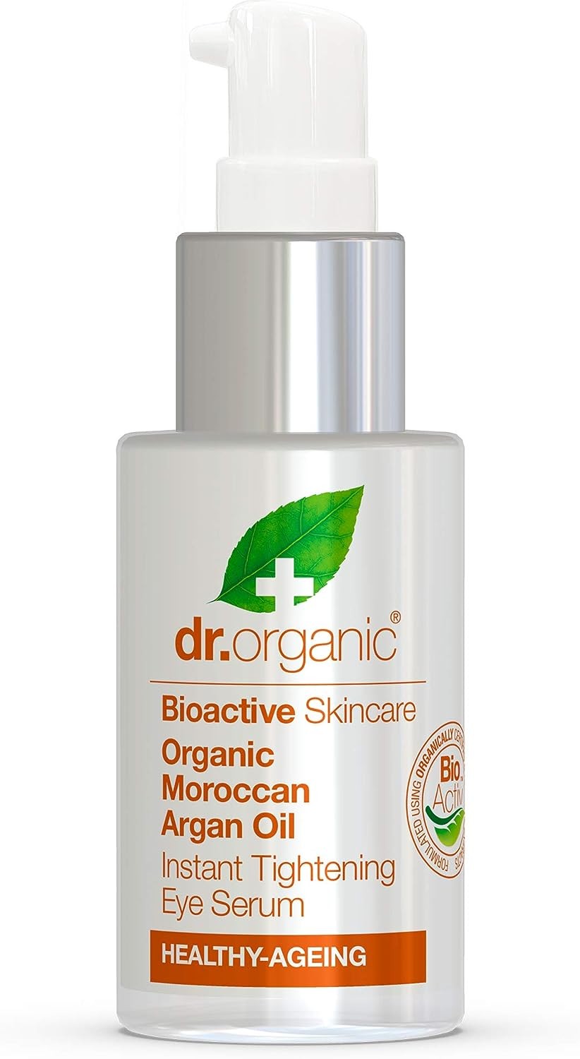 Dr Organic's Instant Firming Eye Serum contains organic argan oil, vitamins, and antioxidants. It intensely hydrates, improves complexion, and reduces wrinkles and puffiness.