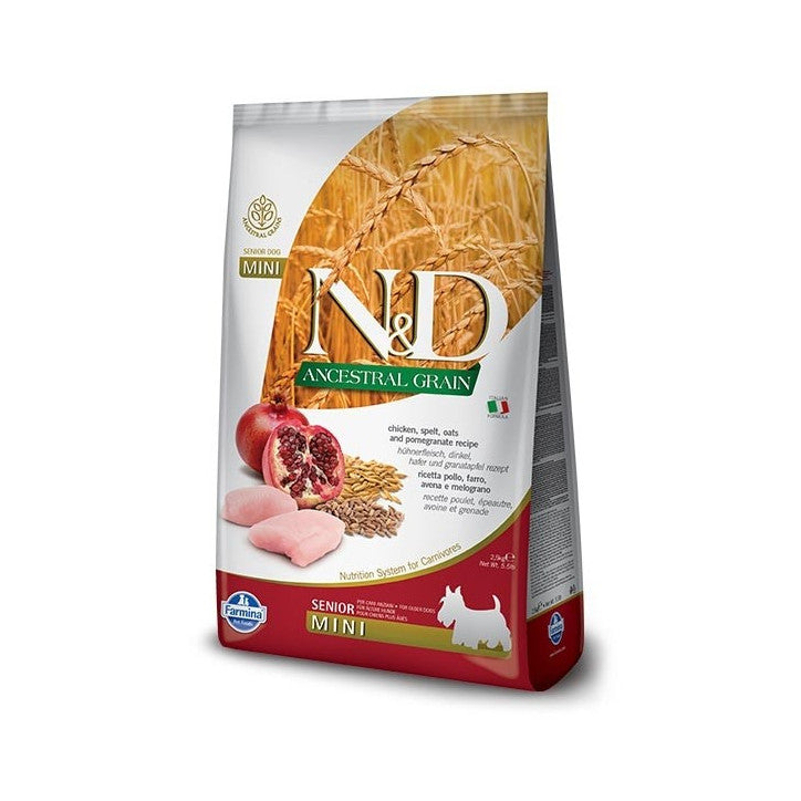 Farmina N&D Dog Senior Ancestral Mini Chicken is a high-quality dry food specifically designed for senior dogs.