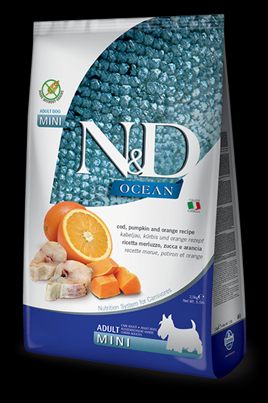 Farmina N&D Ocean Cod and Pumpkin dog food, 2.5 kg, is a premium dry food specially formulated for small breeds.
