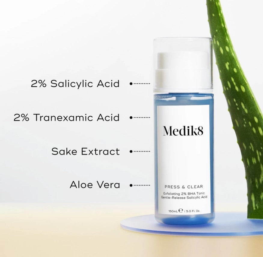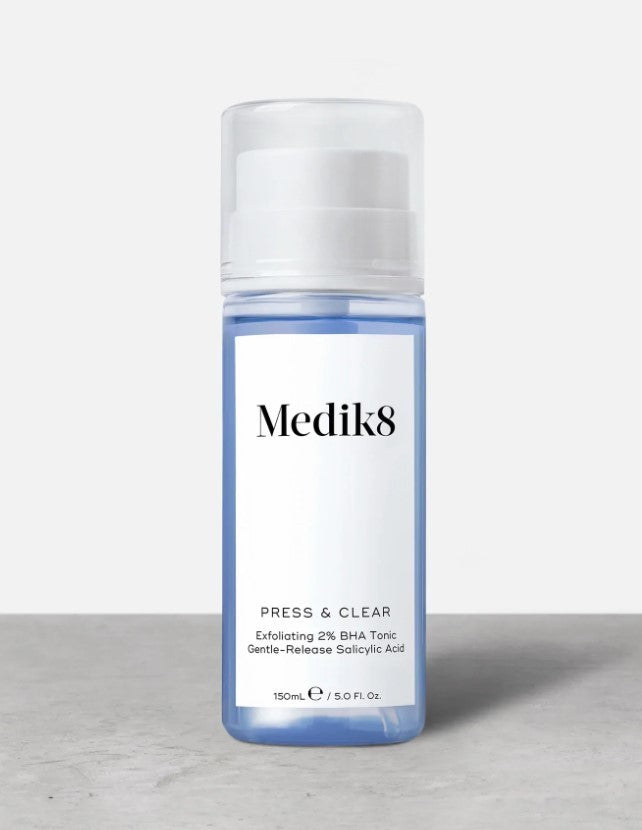Medik8 Press & Clear is a daily exfoliating toner with 2% gentle-release BHA Salicylic Acid to improve the appearance of your skin .