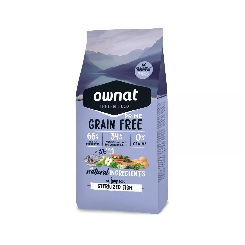 Ownat Prime Grain Free Adult Sterilized Fish is a premium food designed for sterilized cats that offers 20% fresh fish, guaranteeing high quality protein and an unmatched taste.