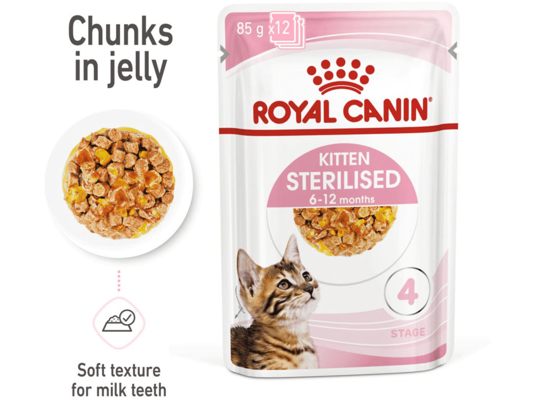 Royal Canin Kitten Sterilised is a wet food in jelly, specially formulated for sterilized kittens from 6 to 12 months.