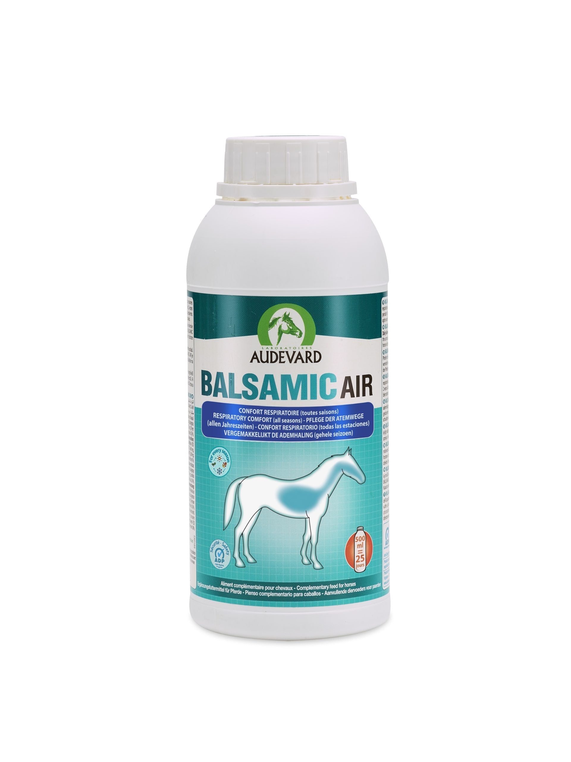 Audevard Balsamic Air es un suplemento respiratorio de 500 ml, ideal para caballos que necesitan apoyo respiratorio, especialmente en climas fríos.