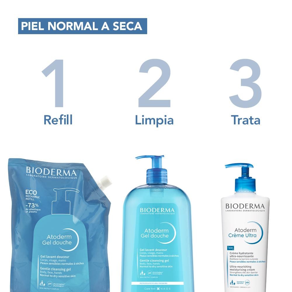 Atoderm Gel de ducha ECO-Refill, el gel de limpieza suave sin jabón que respeta la piel.