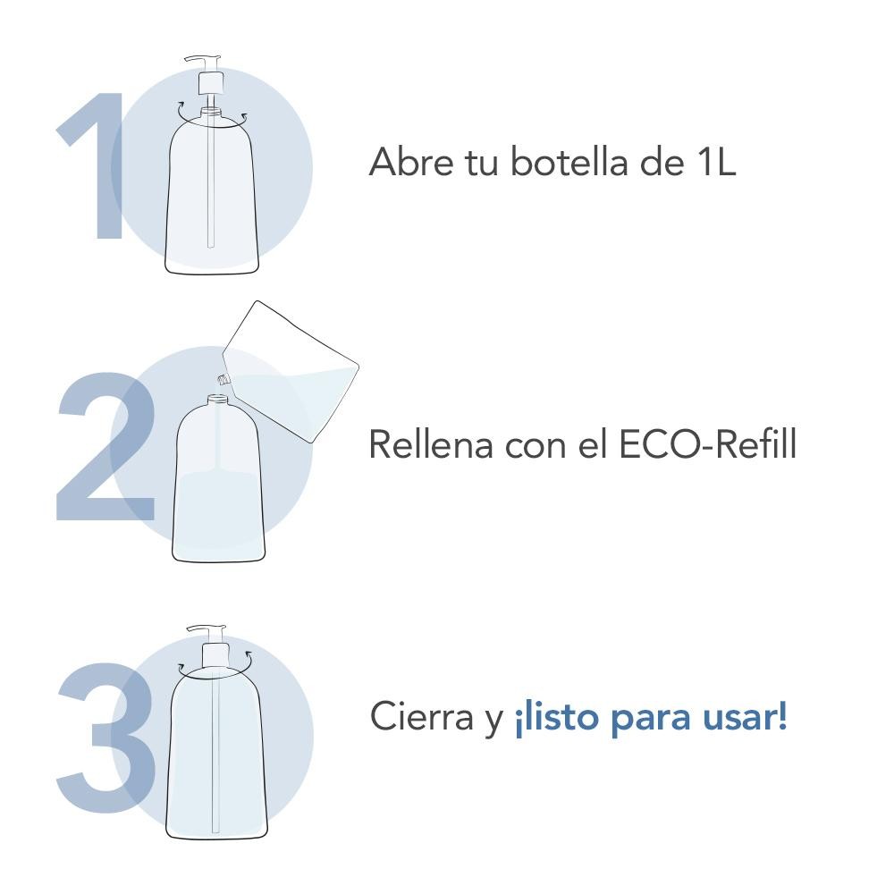 Formato de recarga con un 71% menos de plástico para que puedas rellenar tu dispensador de Atoderm Gel de ducha 1L.