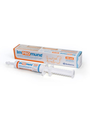 El **Impromune Pasta Palatable 30ml** de **Bioiberica** es un complemento alimenticio formulado para fortalecer el sistema inmunitario de perros y gatos. Gracias a su contenido en **Nucleoforce**, un extracto de levadura rico en nucleótidos, y **AHCC**, un extracto de Lentinus edodes, este producto modula la actividad de los macrófagos y potencía la interacción con los linfocitos T y la actividad de las células NK. Ideal para cachorros, animales con inmunosupresión y aquellos de edad avanzada. Su formato en pasta lo convierte en una opción sabrosa y fácil de administrar para los animales.