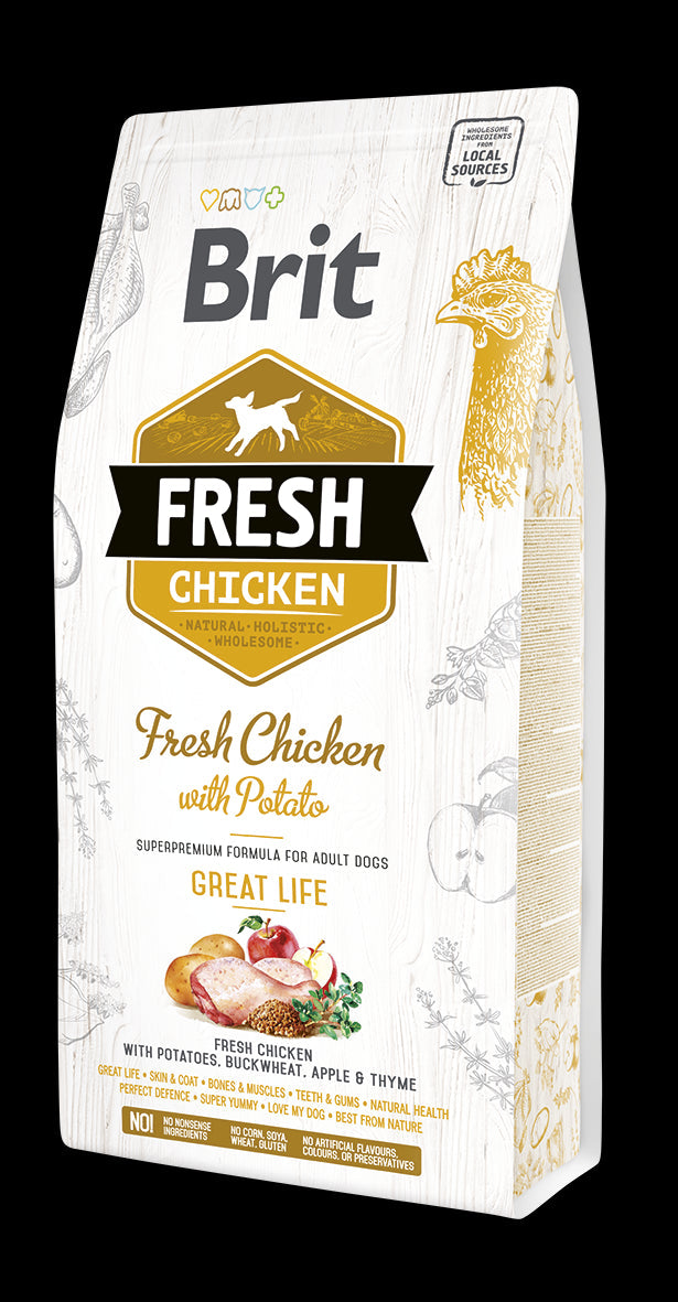 Brit Fresh Great Life Pollo y Patata es un alimento seco superpremium ideal para perros adultos de todas las razas.