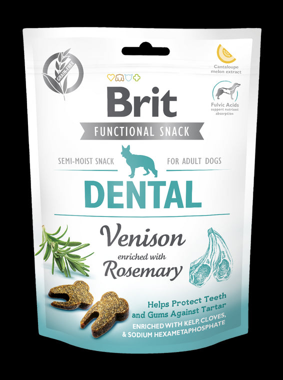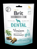 El snack Brit Snack Dental Venado de 150g es una deliciosa y funcional recompensa para perros, enriquecida con carne de venado (26%) y vegetales como calabaza (20%) y lentejas rojas (16%).