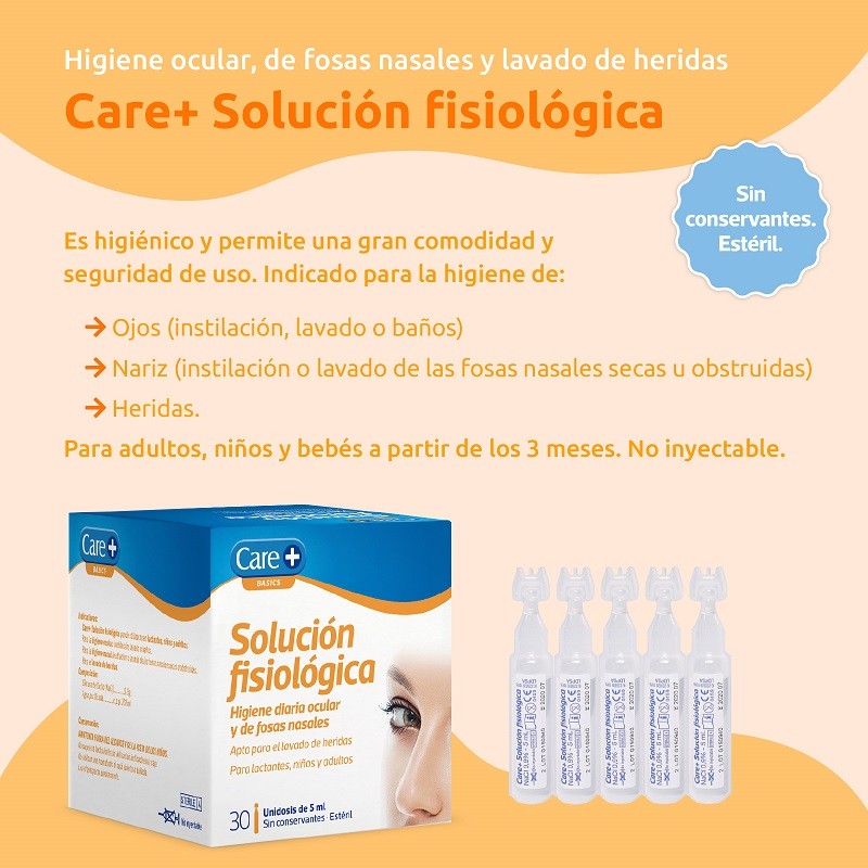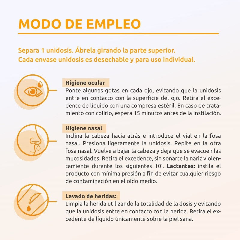 - Suero fisiológico para la higiene diaria, ocular y de fosas nasales.