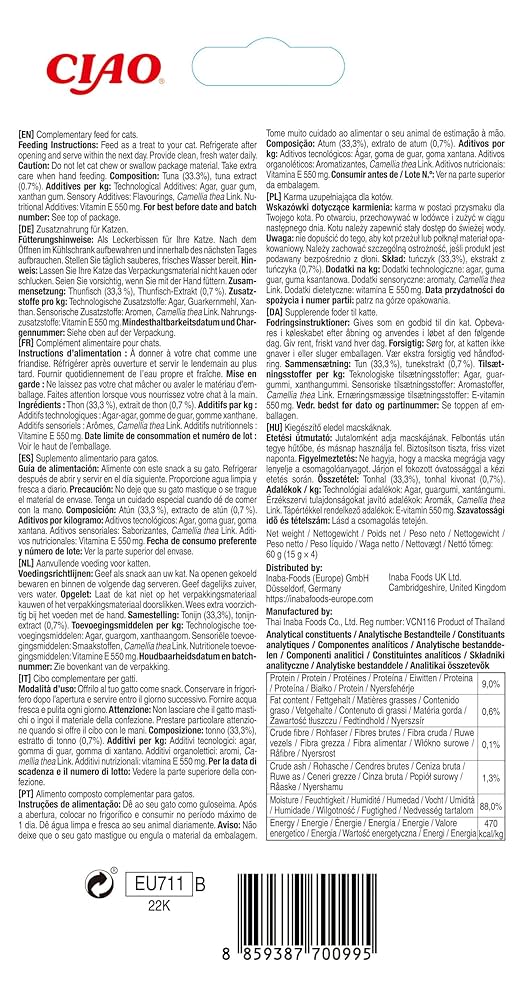 Las golosinas Churu Cat Pops de Atún son un irresistible placer para su gato, elaboradas con 33.3% de atún salvaje, y presentadas en 12 prácticos tubos de 60g cada uno.