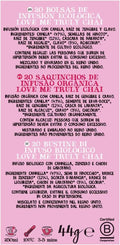 Infusión ecológica Love Me Truly: una mezcla refrescante y reconfortante tipo chai. Con efecto digestivo y sin cafeína. Apto para veganos. 100% orgánico.