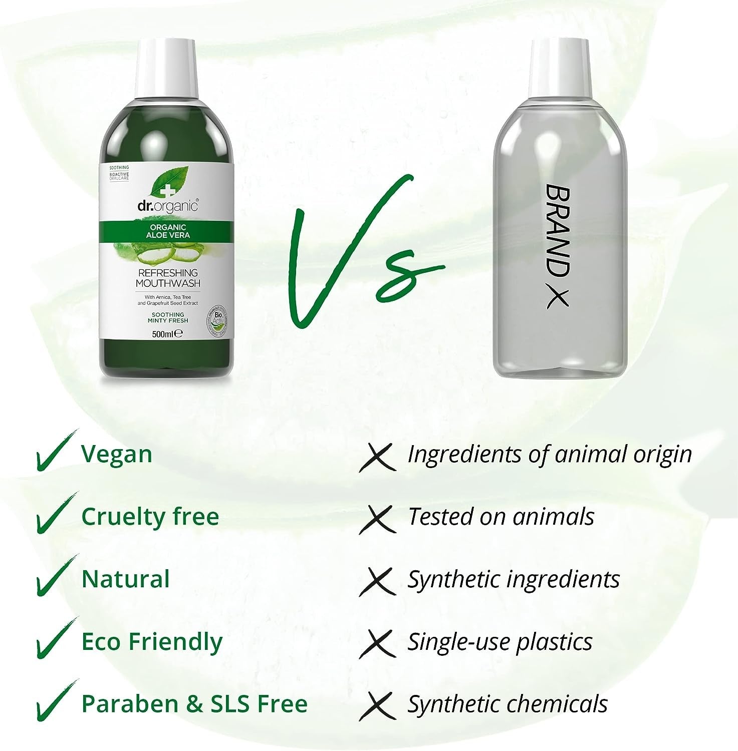Dr Organic Enjuague Bucal de Aloe Vera 500 ml. Cuida tu salud con este enjuague bucal orgánico. Aloe vera y otros ingredientes naturales para una boca sana.