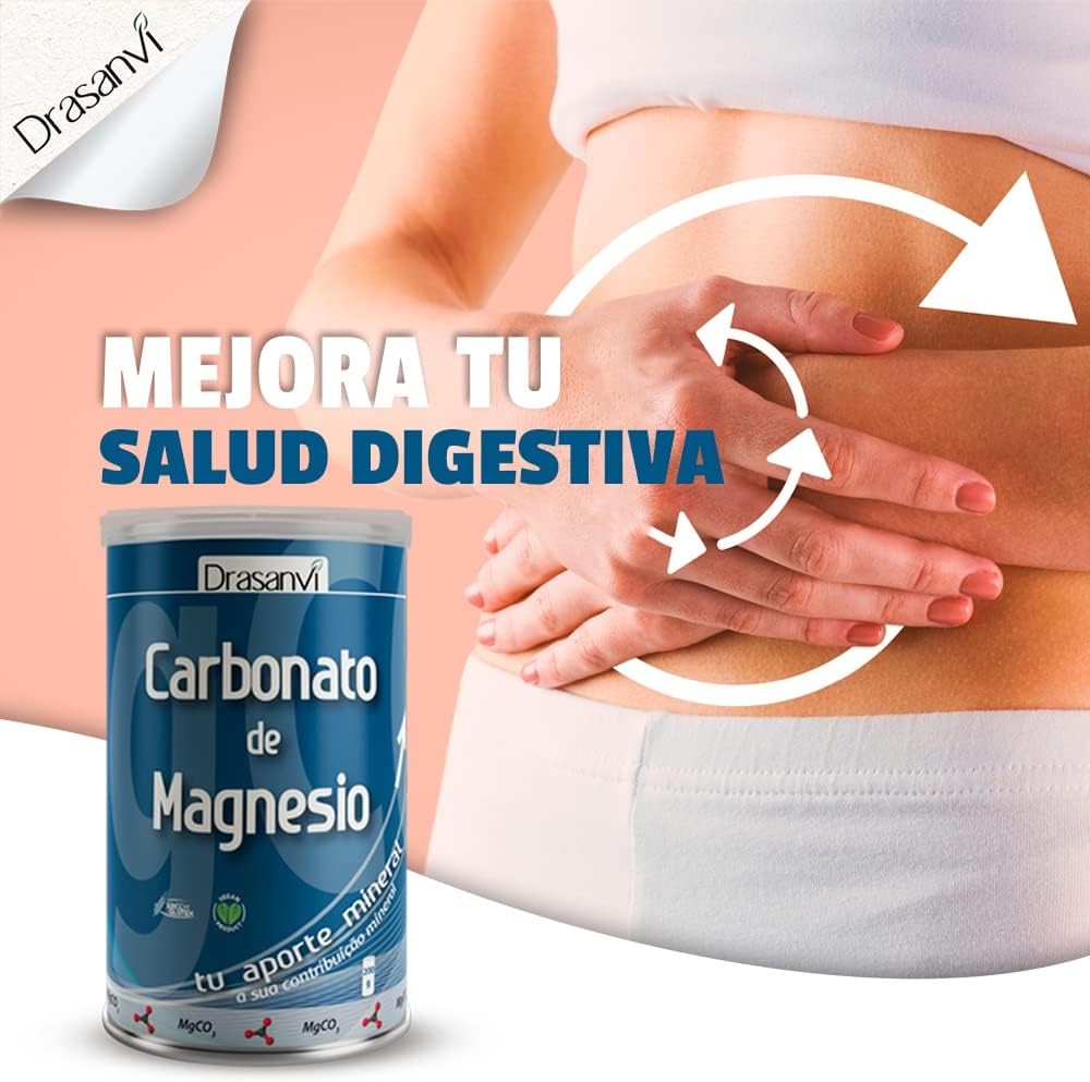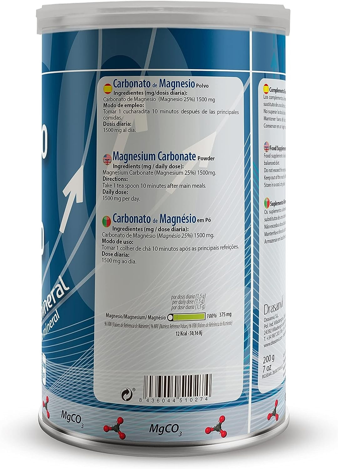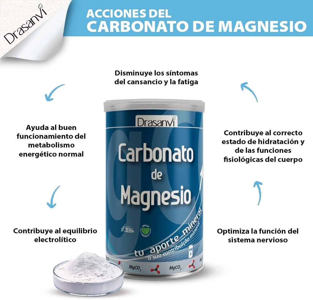 El Carbonato de Magnesio de Drasanvi aporta grandes cantidades de magnesio, contribuyendo a disminuir el cansancio y la fatiga, al equilibrio electrolítico y al metabolismo energético normal. También favorece el funcionamiento normal de huesos, dientes y músculos.