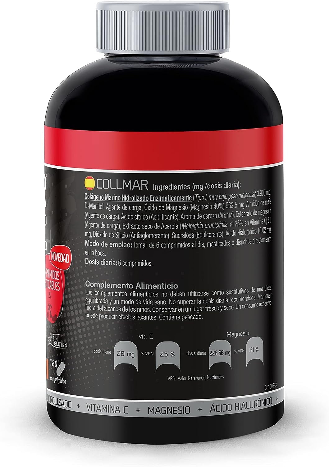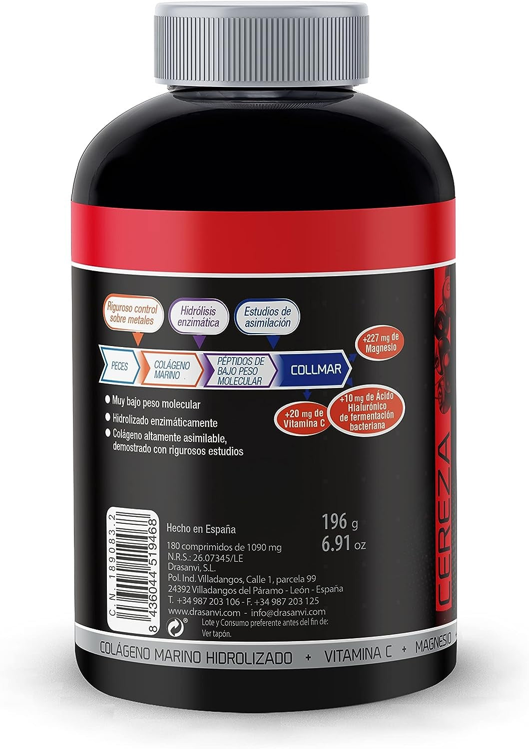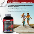 Complemento alimenticio sabor cereza a base de colágeno marino hidrolizado, magnesio y ácido hialurónico.