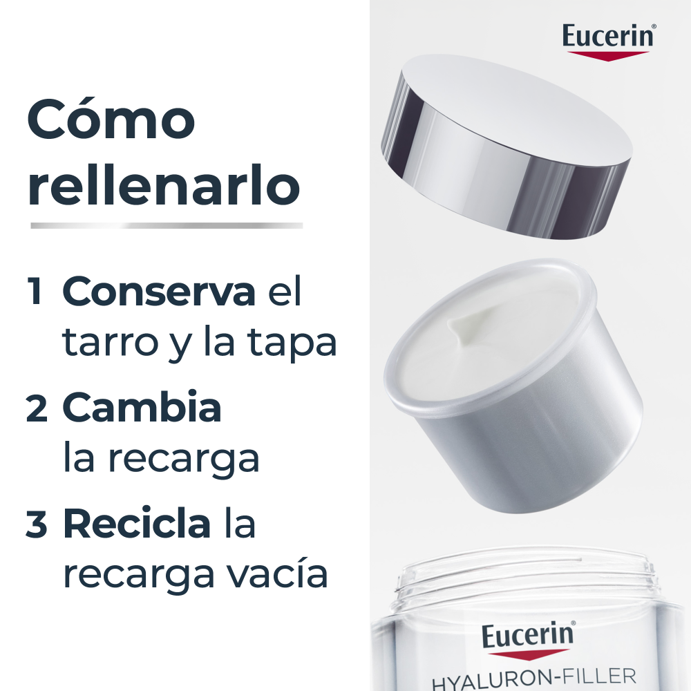 Esta Recarga de Eucerin Hyaluron-Filler Crema de Día FPS 30 contiene un 90 % menos de plástico en comparación con el envase habitual de Eucerin Cuidado Facial.