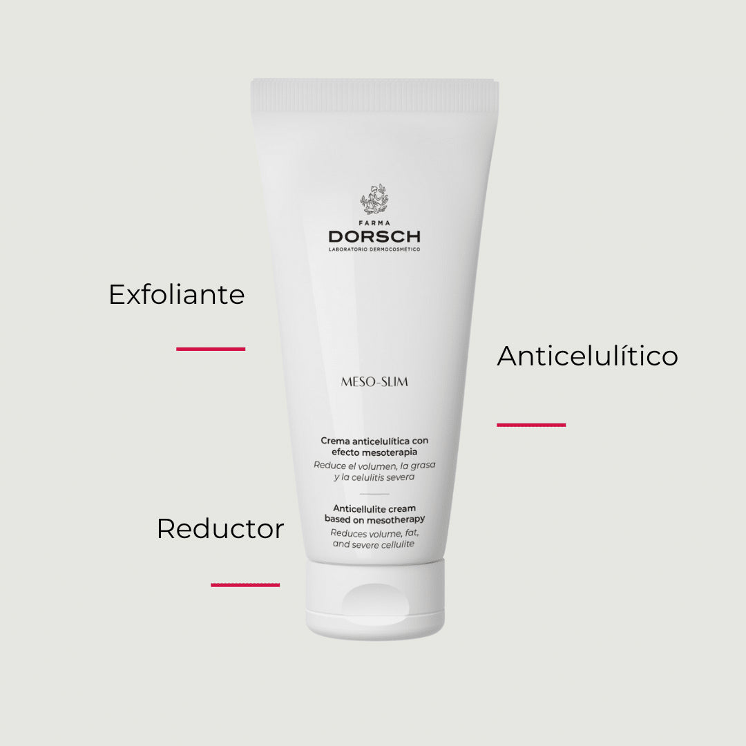 - Meso-slim combina dos potentes acciones: anticelulítica y exfoliación.
