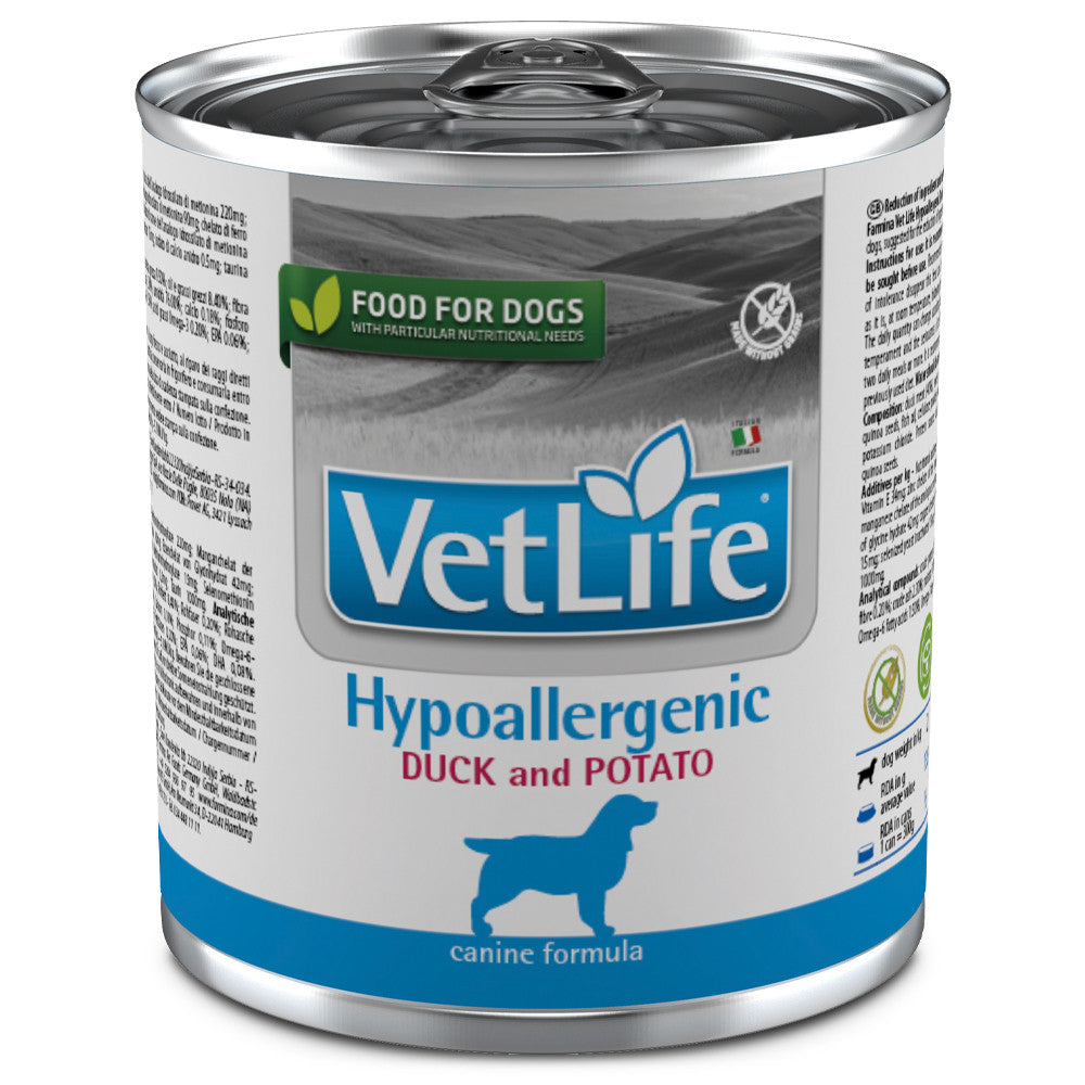 Farmina Vet Life Hipoalergénico Pato en lata de 300g es un alimento húmedo dietético diseñado para perros adultos con intolerancias alimentarias.