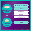 - Conácido fólico, vits D, B, A, C, E, colina, luteína, yodo, selenio y zinc.