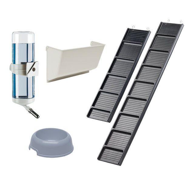 Equipado con dos pisos, un comedero, una botella de agua y un tazón, este modelo facilita el movimiento y la alimentación.