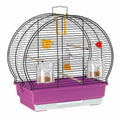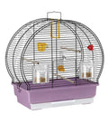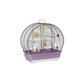 Fabricada en metal pintado, incluye accesorios prácticos como un bebedero, dos comederos giratorios, perchitos y un columpio.