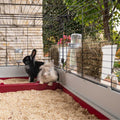 Incluye todo lo necesario: comedero, dispensador de heno, dos botellas de agua y una casa que también sirve como plataforma.