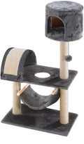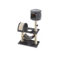 Su robusta estructura incluye un poste de sisal natural, perfecto para el afilado de uñas, y una zona elevada en forma de hamaca que proporciona descanso y relajación.