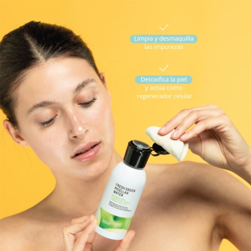 ¿Quieres limpiar tu rostro de manera rápida y cómoda, respetando tu piel? ¡El agua micelar Fresh Green Micellar Water va a marcar un antes y un después en tu rutina facial! Con base acuosa, su formulación retira las impurezas y trazas de maquillaje que haya en tu rostro, dejando una piel limpia y suave mientras respeta la barrera dérmica. ¡Su perfume de manzana te va a enamorar!