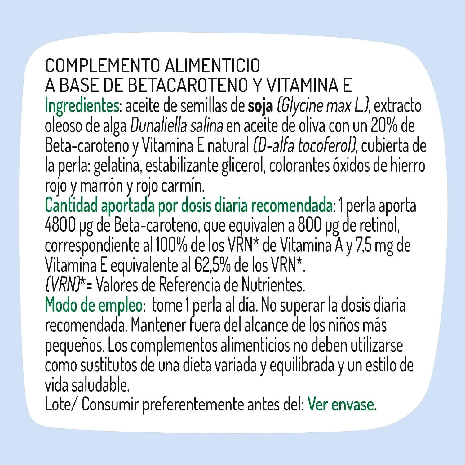 Complemento alimenticio, elaborado con betacaroteno natural y vitamina E, este suplemento protege tu piel y fortalece tu sistema inmunitario.