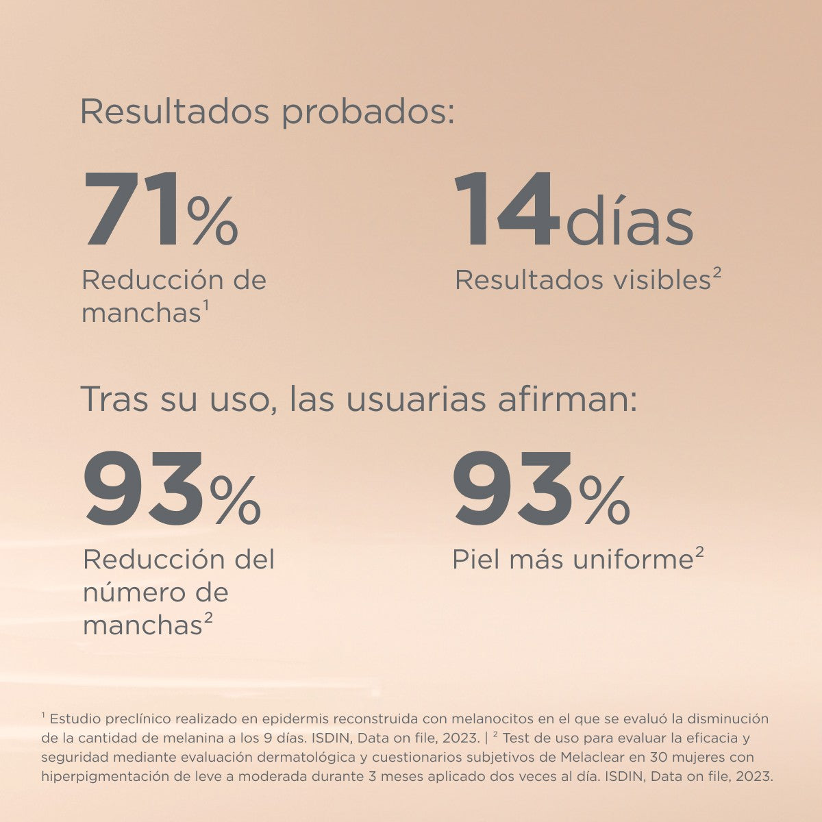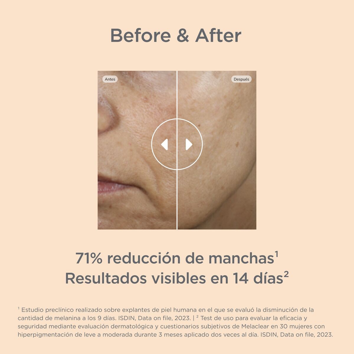 - Reducción de Manchas: Melaclear ofrece un 71% de reducción de manchas¹ en solo 14 días².