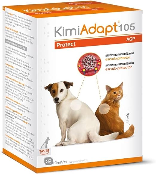 Kimiadapt 105 es un suplemento alimenticio en comprimidos diseñado para fortalecer el sistema inmunológico de perros y gatos de más de 10 kg.