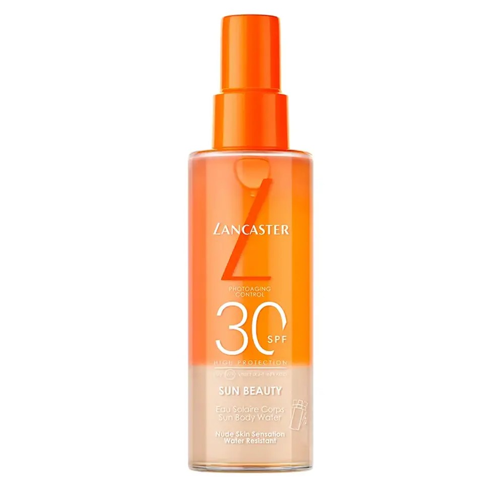 Descubre la Agua Solar Corporal SPF30 de LANCASTER, un protector solar bifásico que ofrece protección completa y un bronceado dorado.