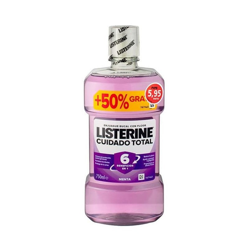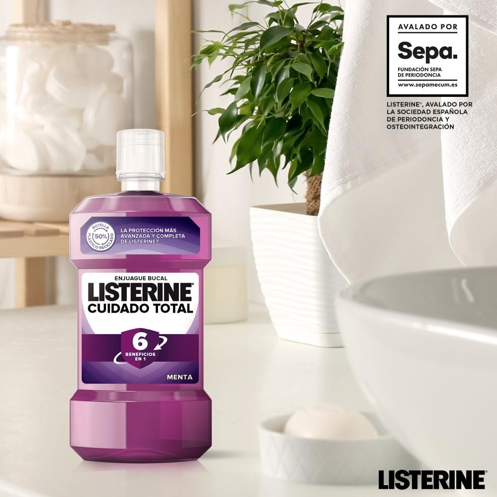 LISTERIN CUIDADO TOTAL es el mejor LISTERINE para la salud total de tu boca. Gracias a la acción combinada de los aceites esenciales con el flúor y el cloruro de zinc, LISTERINE CUIDADO TOTAL garantiza una mejor limpieza y protección completa aportando 6 beneficios para la salud total de tu boca.