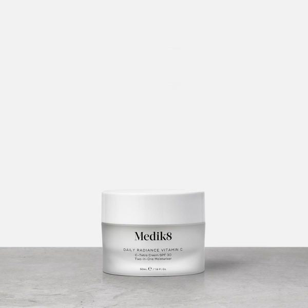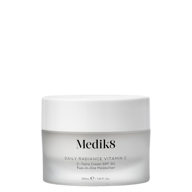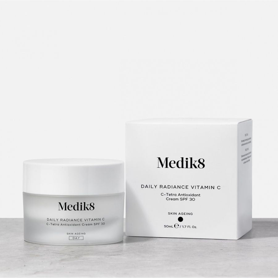 7Crema Daily Radiance Vitamin C de Medik8, es una crema hidratante y antioxidante C-Tetra con una textura ligera como cachemir. Se absorbe por la piel después de la aplicación, proporcionando una potente protección antioxidante junto con un producto no graso de SPF 30 de amplio espectro.