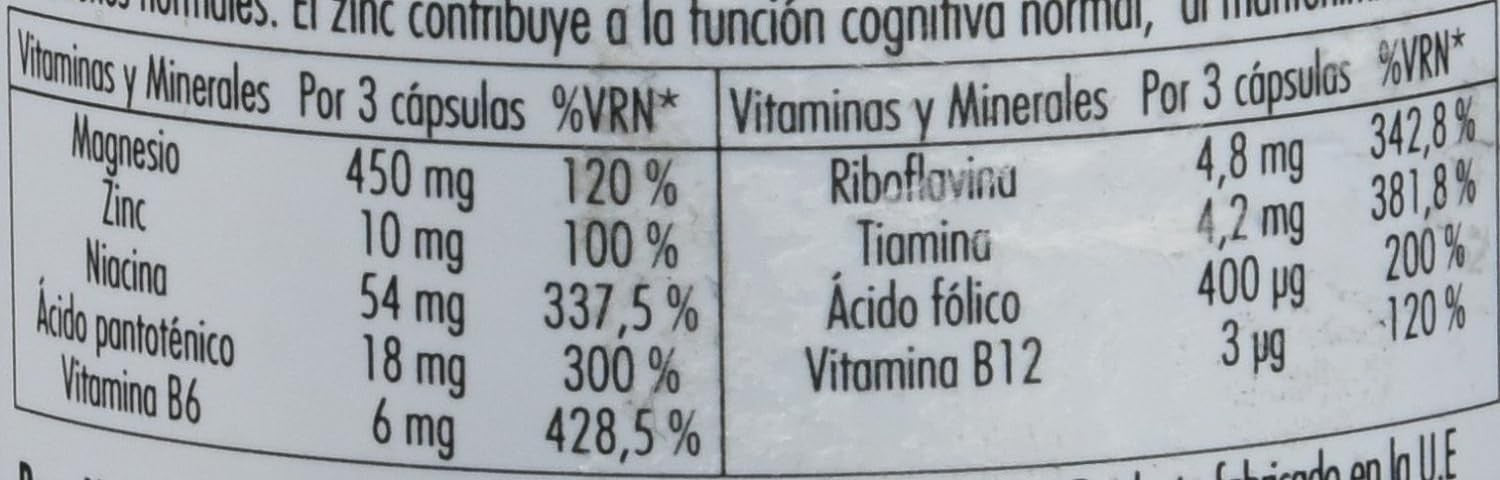 Complemento de magnesio, vitaminas B y zinc para el funcionamiento normal de los músculos y el sistema nervioso.