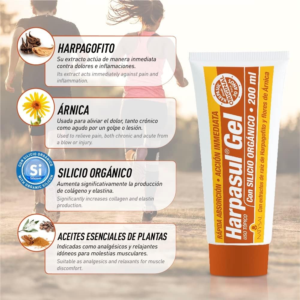 Gel balsámico de buena absorción con extractos de Harpagofito, Árnica y Silicio Orgánico.