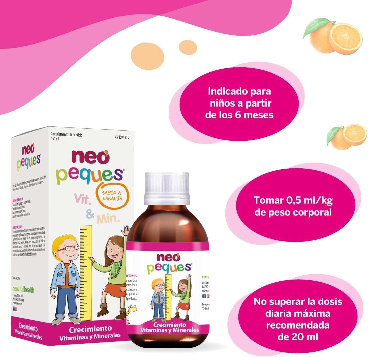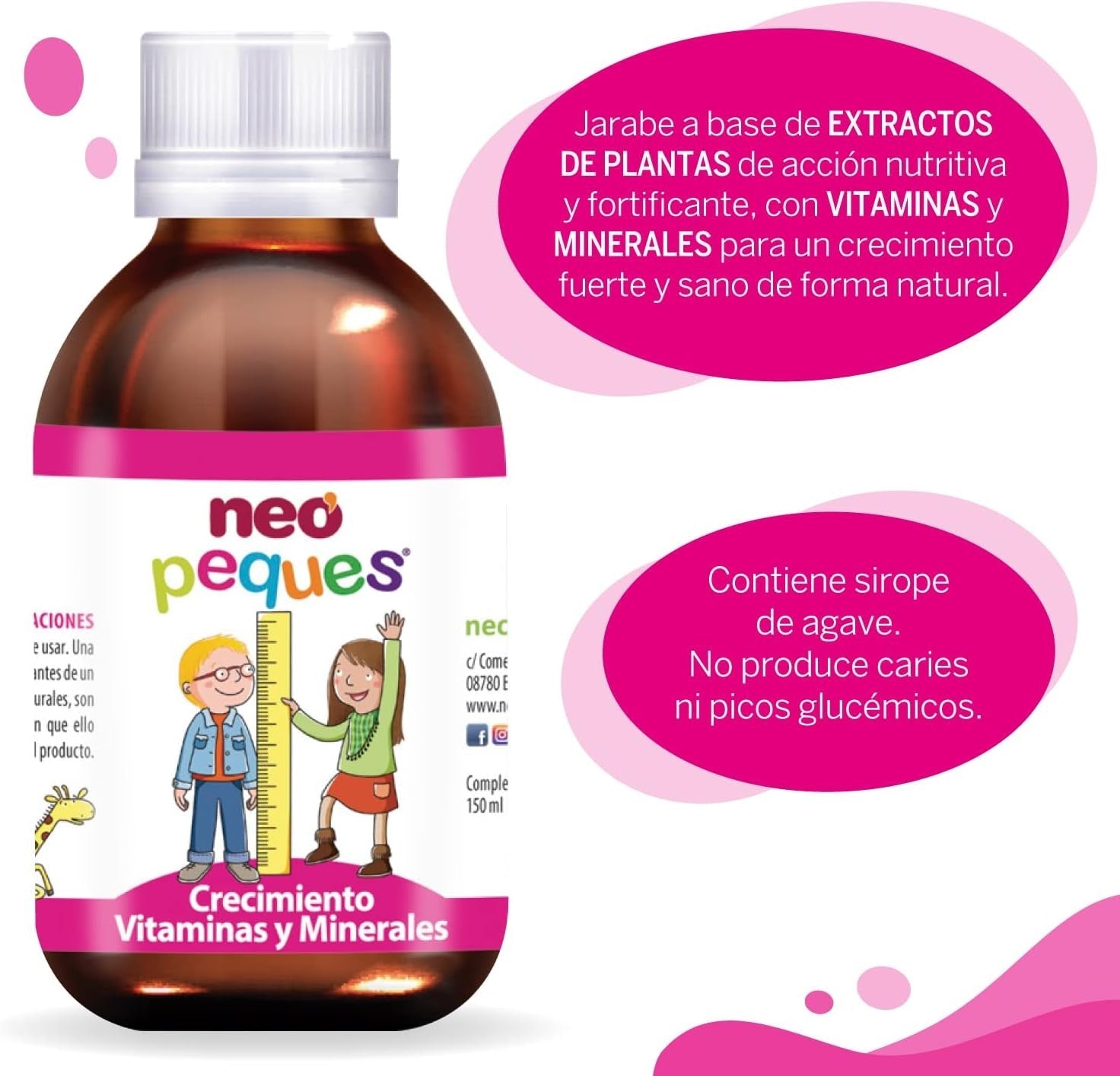 Neo Peques Crecimiento 150ml, la opción natural para cuidar de los niños en diversas circunstancias de salud. Vitaminas y minerales para déficits en la dieta, recuperación tras convalecencias o anemias. Contiene Vitaminas, Minerales, Zanahoria y Espinacas.