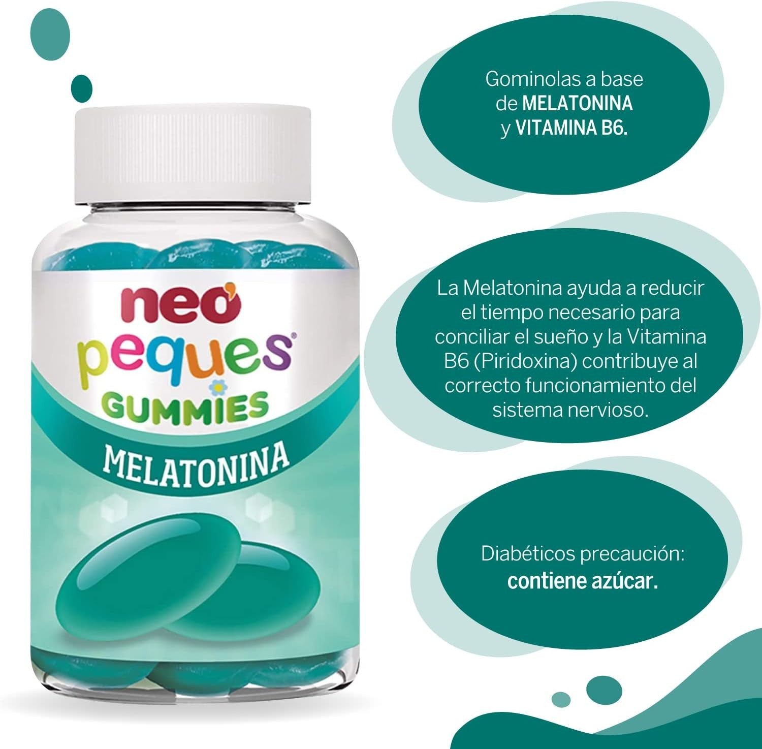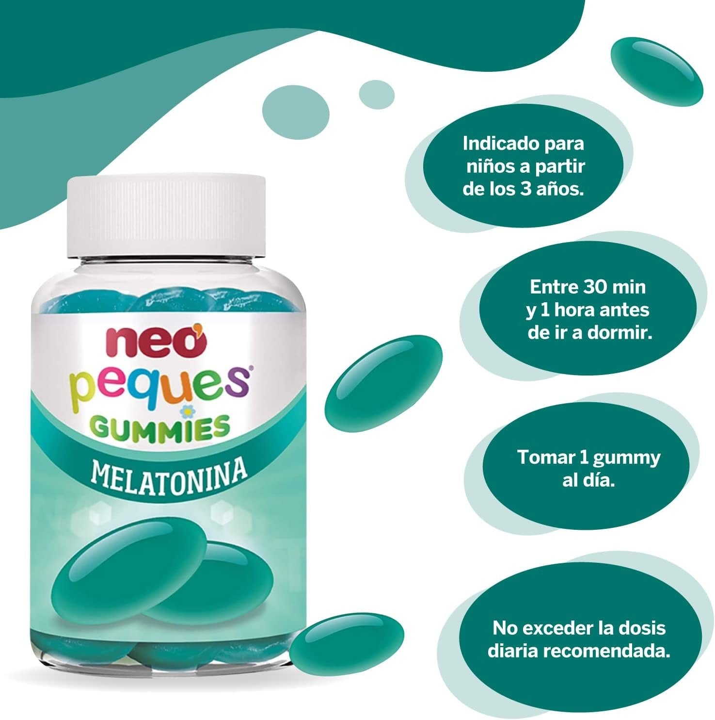Neo Peques Melatonina 30 Gummies, gominolas funcionales con melatonina y vitamina B6. Sabor a mora. Sin gluten. Cuida el sueño de los más pequeños.