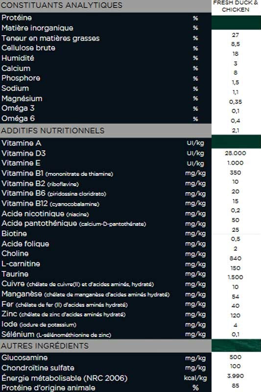 Con un 60% de carne fresca de pato y pollo, este alimento proporciona proteínas de calidad superior, siendo 100% libre de cereales y bajo en grasa, ideal para un peso saludable.