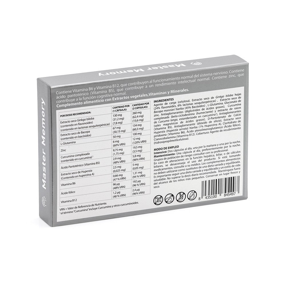 Master memory es un complemento alimenticio que contiene vitamina B5 ayuda al rendimiento intelectual normal. El zinc contribuye a la función cognitiva normal.
