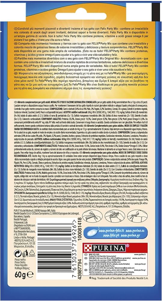Purina Felix Party Mix Original 8x60g es un sabroso snack ideal para mimar a tu gato con irresistibles sabores de pollo, hígado y pavo.