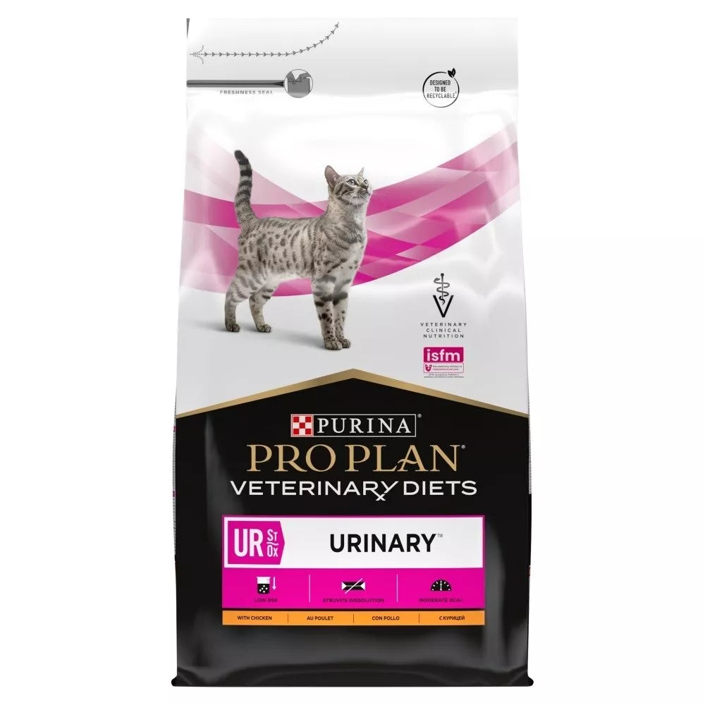 Purina Pro Plan Vet Feline UR con sabor a Pollo es un alimento veterinario de 5 kg diseñado para gatos con problemas del tracto urinario inferior (FLUTD).