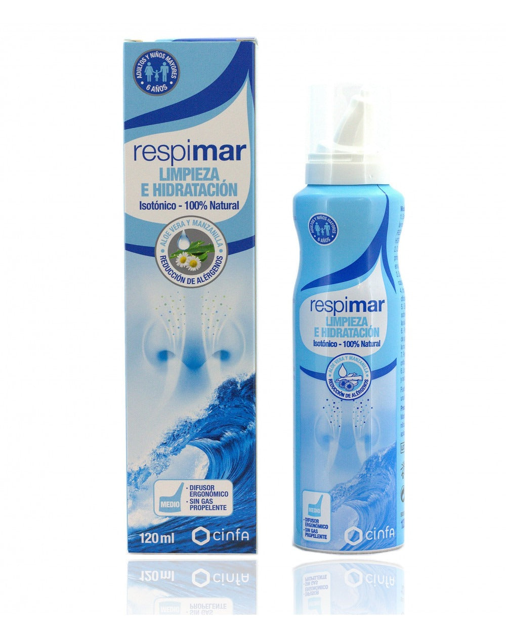 Descubre Respimar Limpieza e Hidratación 120ml, una solución isotónica con aloe vera y manzanilla para la higiene nasal.