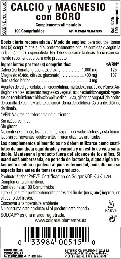 Solgar Calcio/Mag Plus+ Boro: Favorece el sistema nervioso y muscular, aumenta la energía y reduce el cansancio.
