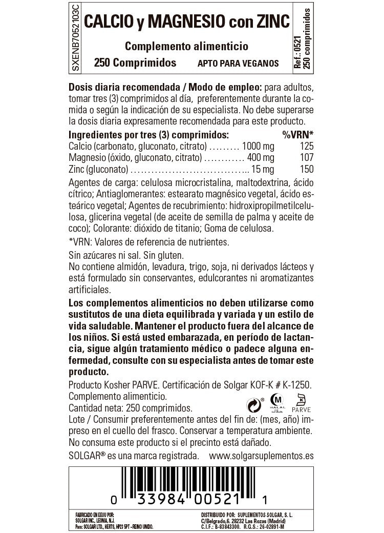 - Complemento Alimenticio con Calcio, Magnesio y Zinc.