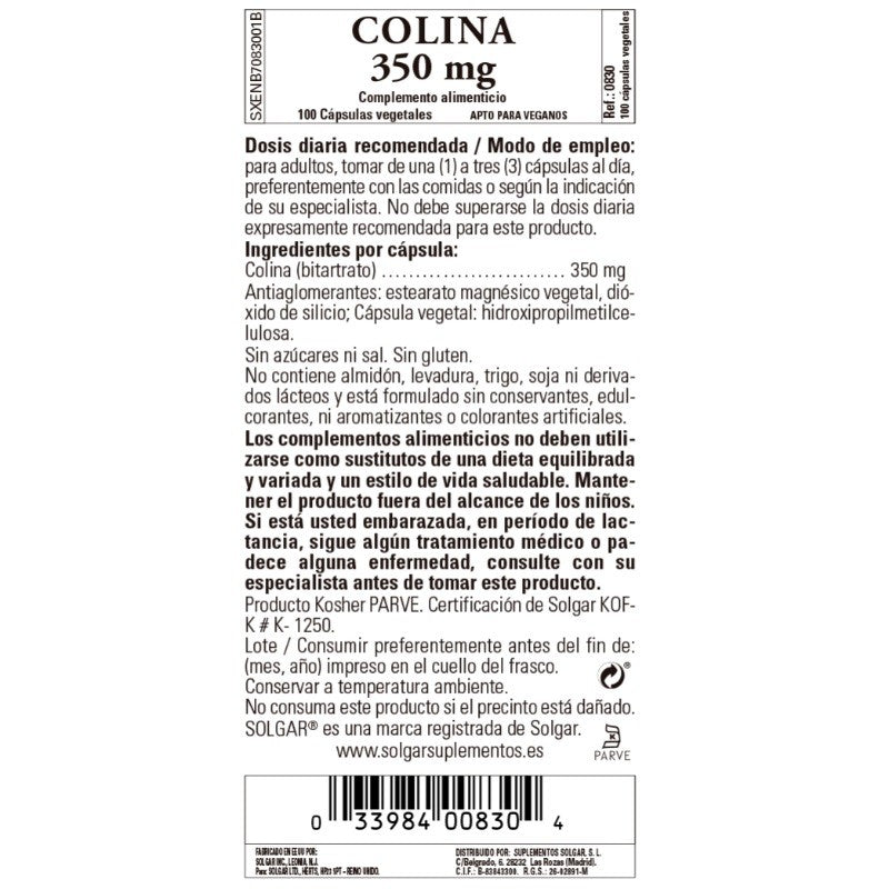SOLGAR Colina 350mg (100 Cápsulas Vegetales)