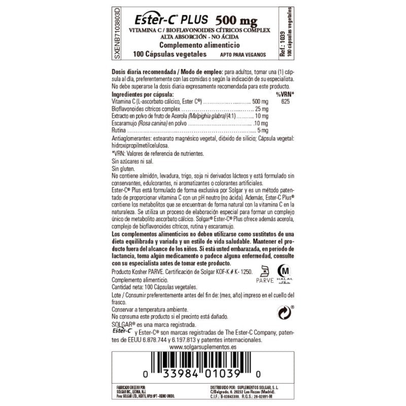 SOLGAR Ester-C Plus 500mg Vitamina C 100 Cápsulas Vegetales