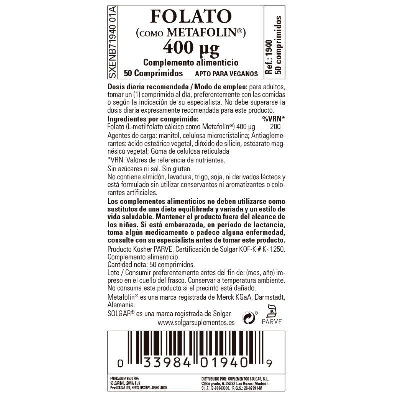 SOLGAR Folato (como Metafolin) 400mcg 50 comprimidos