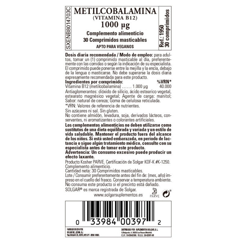 SOLGAR Vitamina B12 Metilcobalamina 30 comprimidos masticables